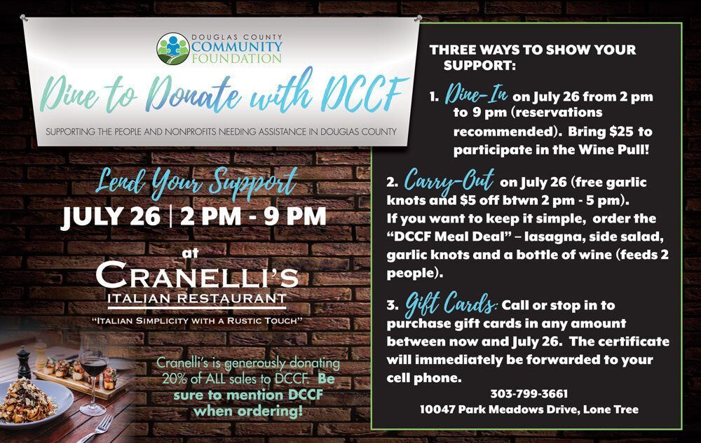 2. CARRY-OUT on July 26 (free garlic knots and $5 off between 2pm and 5pm). If you want to keep it simple, order the "DCCF Meal Deal" - lasagna, side salad, garlic knots and a bottle of wine (feeds 2 people).